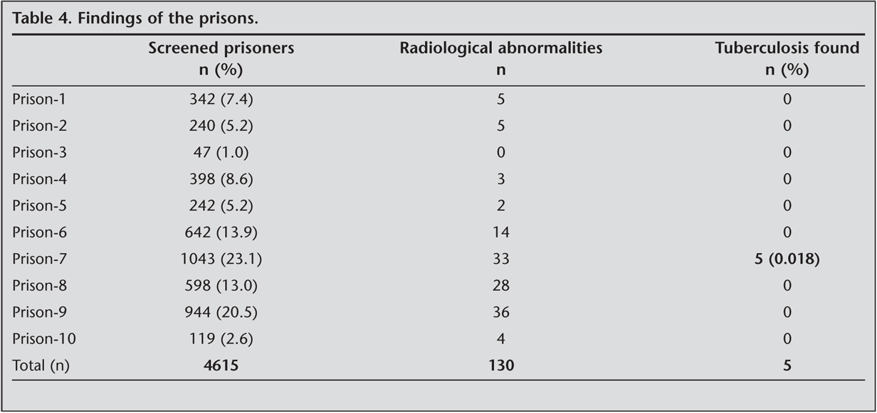 All of the tuberculosis cases were at the same prison (Prison 7) which was the biggest and most crowded of all. Findings of each prison were shown in Table 4.