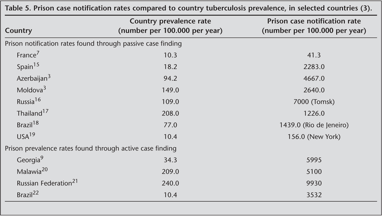 Other common issue is the administrative problems of the prisons in Turkey. Three different ministries (MoH, MoJ, MoIA) are responsible to report prison health data. This complex administrative structure often interferes routine screening protocol, data reporting system and the implementation of effective tuberculosis control, so delayed diagnosis, and inadequate treatment results in prolonged transmission. To obtain most reliable data we initially built a bridge between these three ministries and urged them to collaborate with each other. Our study has shown that active tuberculosis prevalence (108/100.000) among prisoners in Turkey was four times higher than the country prevalence (29/100.000) in 2006 (14). This result is smilar to worldwide. The prevalence rates of tuberculosis in prisons usually exceed prevalence rates in the specific country substantially. As shown in Table 5, tuberculosis rates of over 3000 per 100.000, as compared to the general population, are not unusual (3).