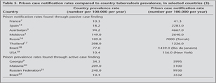 Approximately 10 million people around the world are incarcerated, mostly in prisons. Occurrence of active tuberculosis in prisons is usually reported to be much higher than average levels reported for the corresponding general population (1,2,3). Late tuberculosis case finding and delays in treatment are common problems in many prisons (2). Conditions within prisons (poor health services, poor nutrition, poor physical condition, drug addiction and presence of other diseases) are conductive to the spread of TB (4,5). Moreover, prisons represent a reservoir for disease transmission; the tuberculosis infection may spread into the general population through prison staff, visitors, and close contacts of released prisoners (6,7).