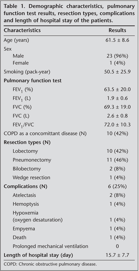 One (4%) female and 23 (96%) male patients were included in this study with age range from 43 to 75. Mean age was 61.5 ? 8.6 years. All of the patients were smoker. Mean value for cigarette usage was 50.5 ? 25.9 pack-year. There were only 10 patients (42%) with concomitant COPD. Pneumonectomy, lobectomy, bilobectomy and wedge resection were performed in 11 (46%), 10 (42%), 2 (8%), and 1 (4%) patients, respectively. Complications occurred only in 6 (25%) patients. There was no prolonged mechanical ventilation as postoperative complication. Demographic characteristics, pulmonary function test results, types of lung resection, complications, hospital stay data of 24 patients participated in this study are given in Table 1.