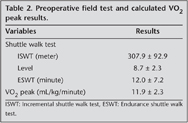 In some studies, although concordant relationship between cardiopulmonary exercise test results (measurement of maximal oxygen uptake) and predicted post-operative pulmonary complications have been reported, the controversial reports in the publications are also available (2,3,7,15). However, in our study, peak VO2 calculated via the walking distance of the ISWT was used for the evaluation of maximal exercise capacity and no effect in predicting for post-operative complications for resection surgery could be found.