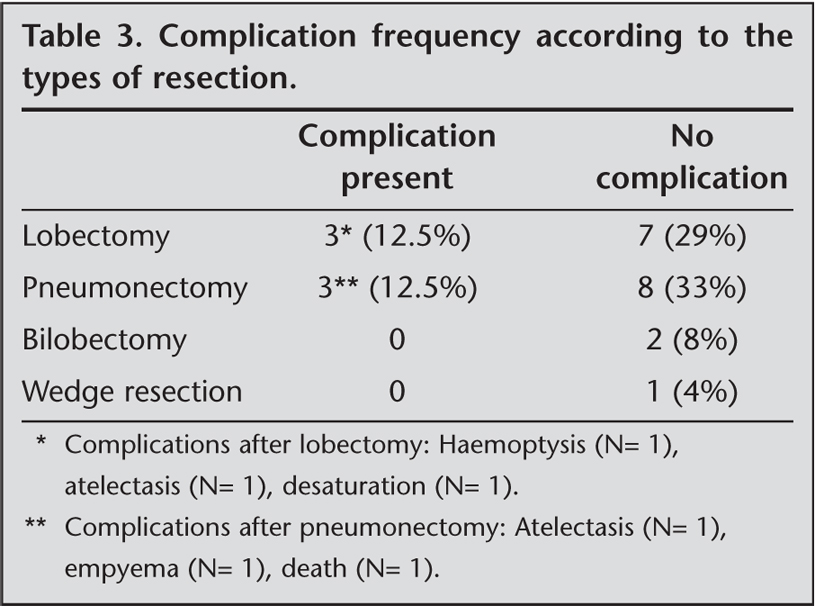 To date, in the studies a correlation between the resection width and postoperative mortality and morbidity is reported. While segmental or "wedge" resections are carrying a low risk for developing post-operative complications, pneumonectomy has been reported to have the highest risk (3,8,9,10). In our study, no relationship was determined between types of resection and the development of post-operative complications.