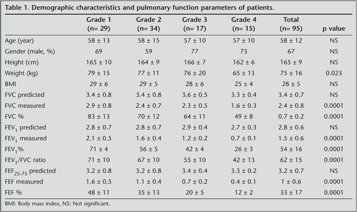 According to Global Initiative for Chronic Obstructive Lung Disease (GOLD) guideline, patients having the diagnosis of COPD were considered for the study (2). Patients who accepted to join in the study were informed about the purpose and methods of study and informed consent was obtained. Patients were in sinus rhythm on ECG and with normal ejection fraction and without significant heart valve disease; chamber dilatation and hypertrophy on echocardiography were included in this study. Patients having known congenital or acquired heart disease, hypertension, coronary artery disease, diabetes mellitus, renal or hepatic disease were excluded from this study. Patients meeting above inclusion and exclusion criteria were selected for the study. Twelve lead ECG and afterwards pulmonary function test according to GOLD spirometry guideline? were performed at the same day (4). Classification of severity of air flow limitation in COPD was made according to GOLD classification based on post-bronchodilator FEV1 (2). Electrocardiographic recordings were performed using General Electric MC 1600 ECG device (Chicago, IL, USA). The values of P wave axis, P wave duration, QRS axis and QRS duration are obtained from the computerized report on electrocardiogram. Correlations between the severity of COPD and ECG findings including P wave axis, P wave duration, QRS axis, QRS duration were studied.