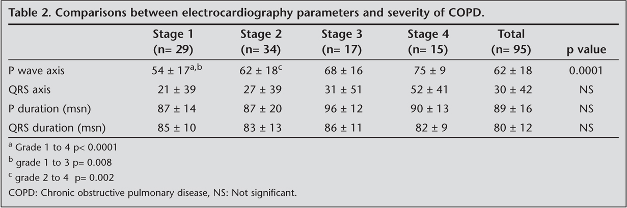Chronic obstructive pulmonary disease (COPD) is a growing major public health problem. In 2020, COPD is projected to rank fifth worldwide in burden of disease, according to a study published by the World Bank/World Health Organization (1). Although COPD has received increasing attention from the medical community in recent years, it is still relatively unknown or ignored by the public as well as public health and government officials (2). In the United States, morbidity caused by COPD is approximately 4%, thus, COPD is ranked as the fourth leading cause of chronic morbidity and mortality after heart attacks, malignancies and strokes (3). COPD, leading reduced lung function, is a strong risk factor for cardiovascular events. COPD and heart diseases often co-exists. Therefore, in daily clinical practice, cardiologists frequently come across patients with COPD. Increased bronchial obstruction and increased pulmonary vascular resistance impairs right atrial functions. In this study, we aimed to investigate the effect of bronchial obstruction on P wave axis in patients with COPD and usefulness of electrocardiography (ECG) findings in the evaluation of severity of COPD classified by spirometry according to the updated new GOLD guidelines (2).