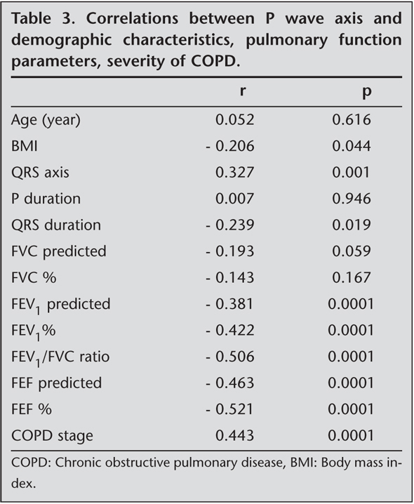 Bulgular: Ortalama ya? 58 ? 12 y?l idi. Ortalama p dalga aks? 62 ? 18 derece idi. Bu ?al??mada, p dalga aks?, KOAH evreleri ve QRS aks? ile anlaml? pozitif korelasyonlar, fakat FEV1, FEF, BMI ve QRS s?resi aras?nda anlaml? negatif korelasyonlar ortaya koydu. KOAH evreleri artt?k?a p dalga aks? artmaktad?r.