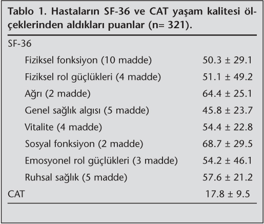Hastalara uygulanan genel ya?am kalitesi anketlerinden SF-36 anketi ve CAT sonu?lar?na g?re bulgular Tablo 1'de yer almaktad?r.