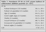 Ya?am kalitesi de?erlendirmesi i?in yayg?n olarak kullan?lan genel bir ?l?ek olan T?bbi Hastal?klar Sonlan?m ?al??mas? (Medical Outcome Study, MOS) K?sa Form-36 (SF-36) kullan?lm??t?r. SF-36 Ware ve Sherbourne taraf?ndan geli?tirilmi?tir ve T?rk?e g?venilirlik ve ge?erlilik ?al??mas? Ko?yi?it ve arkada?lar? taraf?ndan yap?lm??t?r (6,7). SF-36 bir ?z-bildirim ?l?e?idir ve fiziksel i?levsellik, sosyal i?levsellik, rol g??l?kleri (fiziksel ve emosyonel), ruhsal sa?l?k, canl?l?k (vitalite), a?r? ve sa?l???n genel olarak alg?lanmas? gibi sa?l???n sekiz boyutunu 36 maddeyle incelemektedir. ?l?ek 0-100 aras?nda de?erlendirme sa?lamaktad?r ve daha y?ksek puan daha iyi sa?l?k d?zeyini g?stermektedir.