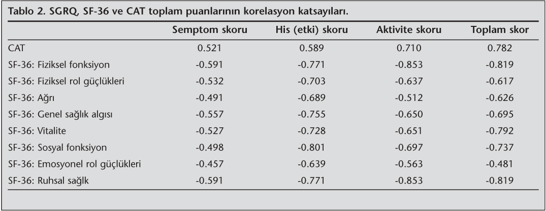 Results: The mean age was 62.4 ? 8.9 years and the mean FEV1 was 51.9 ? 19.2% pred. The coefficient of internal consistency (Cronbach alpha) was 0.8815. The correlation between the total score measured initially and that obtained two weeks later was found to be highly significant (r= 0.90, p< 0.0001). According the results of validation of both total score and the components of SGRQ, the correlation between the total score of SGRQ and CAT was 0.782 (p< 0.0001), SGRQ and SF-36 was between -0.481 ile -0.819 (p< 0.0001). The total and component scores were able to discriminate different disease stages and a significant correlation was found to be with pulmonary function tests.
