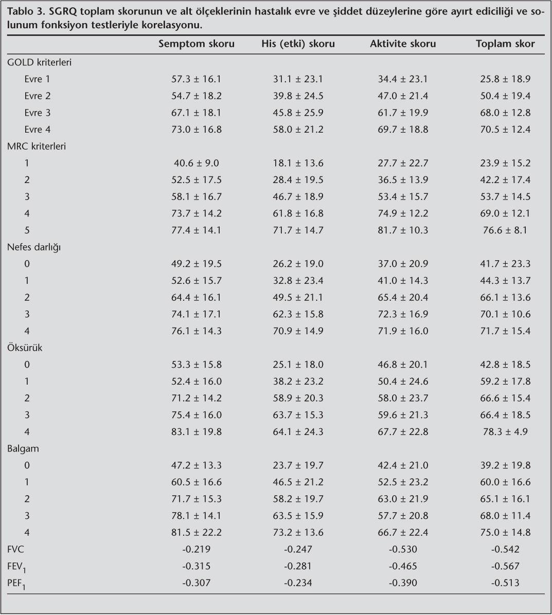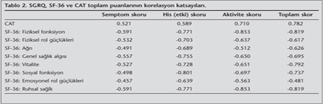 CAT ile SGRQ toplam skorunun korelasyonu 0.782 (p< 0.0001), SF-36 alt ?l?ekleriyle -0.481 ile -0.819 aras?nda bulunmu?tur (p< 0.0001). SGRQ toplam skorunun ve alt ?l?ek skorlar?n?n farkl? hastal?k evreleri, ?iddetleri ve d?zeylerine g?re ay?rt edicili?ine bak?ld???nda, t?m kriter d?zeylerini anlaml? olarak (p<0.0001) ay?rt etti?i ve solunum fonksiyon testleriyle anlaml? d?zeyde korelasyon (p< 0.0001) g?sterdi?i saptanm??t?r (Tablo 2,3).