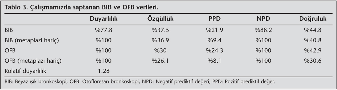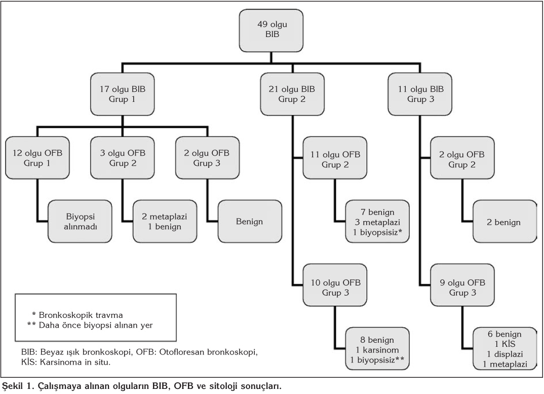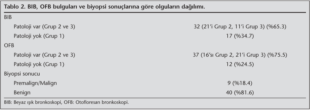 Materyal ve Metod: Primer akci?er kanseri nedeniyle operasyon planlanan 49 hastaya preoperatif beyaz ???k bronkoskopi (BIB) ve otofloresan bronkoskopi (OFB) yap?ld?. BIB bulgular?, birinci grup normal, ikinci grup eritem veya ?dem, ???nc? grup nod?ler lezyonlar veya mukozal d?zensizlik olmak ?zere s?n?fland?r?ld?. OFB bulgular? ise birinci grup normal, ikinci grup hafif kahverengi refle de?i?ikli?i, ???nc? grup koyu kahverengi-k?rm?z? refle de?i?ikli?i olarak s?n?fland?r?ld?. BIB ve OFB'de g?r?len birinci gruptan biyopsi al?nmazken ikinci ve ???nc? gruptaki lezyonlardan biyopsi al?nd?. Yap?lan bronkoskopik inceleme sonucu 12 (%24.5) hastada hem BIB hem de OFB'de patolojik lezyon g?r?lmedi?inden biyopsi al?nmad?. Hastalar?n 32 (%65.3)'sinde patolojik lezyon izlenmesi ?zerine lezyonlardan multipl biyopsiler al?nd?.