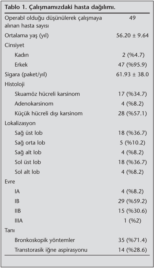?al??maya 2 (%4.7)'si kad?n, 47 (%95.9)'si erkek olmak ?zere toplam 49 hasta dahil edilmi?tir. Hastalar?n ya?lar? 39-75 y?l aras?nda de?i?mekte olup, olgular?n ortalama ya?? 56.20 ? 9.64 y?ld?r. Sigara kullan?mlar? paket/y?l olarak hesaplanm?? olup, 15-180 paket/y?l aras?nda de?i?mektedir. Ortalama sigara kullan?m? 61.93 ? 38 paket/y?ld?r. ?al??maya al?nan olgular?n, OFB'de al?nan biyopsi sonucuyla belirlenen t?m?r histolojilerine g?re da??l?mlar?; %34.7'si skuam?z h?creli karsinom; %8.2'si adenokarsinom, %57.1'i ise k???k h?creli d??? karsinom ?eklinde idi. Hastalar?n 18 (%36.7)'inde primer akci?er karsinomu sa? ?st lobda, 5 (%10.2)'inde sa? orta lobda, 4 (%8.2)'?nde ise sa? alt lobdayd?. Sol ?st lobda yerle?imli t?m?r yine 18 (%36.7) hastada mevcutken, sol alt lob yerle?imli t?m?r 4 (%8.2) hastada mevcuttu. Evre IA olan 4 (%8.2) olgu, Evre IB olan 29 (%59.2) olgu, Evre IIB olan 15 (%30.6) olgu, Evre IIIA olan 1 (%2) olgu bulunmaktayd?. Hastalara primer akci?er karsinomu tan?lar? 35 (%71.4) hastada bronkoskopik y?ntemlerle, 14 (%28.6) hastada transtorasik i?ne aspirasyonu (TT?A) ile konuldu (Tablo 1).