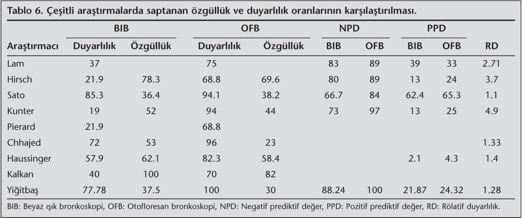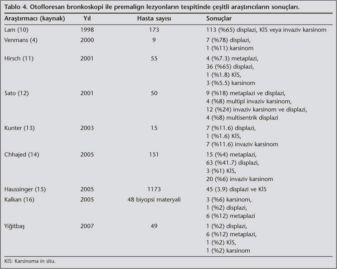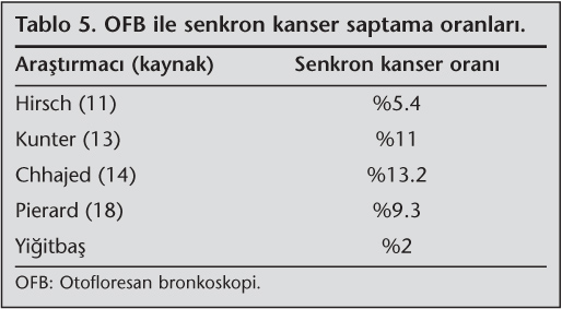 Akci?er kanseri tan?s? konmu? bir hastada alan kanserizasyonu nedeniyle multipl kanser geli?me riskinin oldu?u bilinmektedir. OFB'nin geli?tirilmesinden bu yana ge?en y?llar boyunca OFB'nin premalign lezyonlar ile senkron t?m?r?n tespitindeki yerini ara?t?rmak amac?yla ?al??malar yap?lm??t?r (Tablo 4,5) (4,10,11,12,13,14,15,16,17,18). ?al??malar?n de?erlendirilmesinde her ?al??man?n ayr? protokol? oldu?u izlense de yay?nlanan ?o?u ?al??man?n sonu?lar? birbirine benzer ve birbirini destekler niteliktedir. Ancak ?al??maya al?nan hasta say?lar?n?n birbirinden farkl? oldu?u ve sonu?lar? etkileyebilece?i de g?z ?n?ne al?nmal?d?r. Bizim ?al??mam?z da literat?rdeki ?al??malarla benzer sonu?lar g?stermektedir.