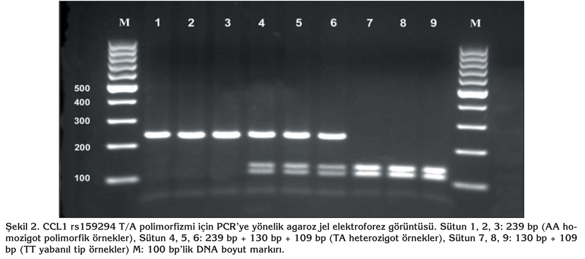 PCR ile amplifiye edilen gen ?r?nleri CCL1 i?in BfaI (FspBI) restriksiyon endon?kleaz enzimi ile muamele edilmi?tir. ?lgili polimorfizmin belirlenmesi i?in %3'l?k agaroz jelde ko?turularak CCL1 i?in yaban?l tip (TT), heterozigot (TA), homozigot polimorfik (AA), olgular? tespit edilmi?tir (?ekil 2).