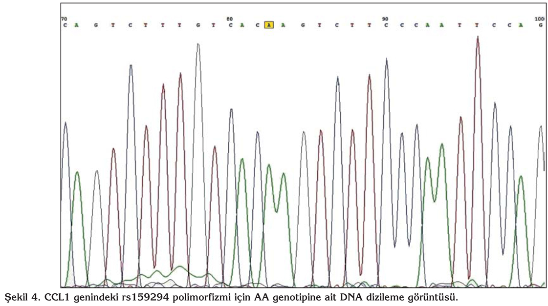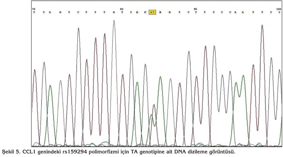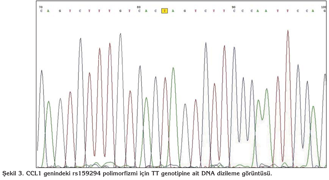 CCL1 genindeki rs159294 polimorfizmi i?in TT, AA ve TA genotiplerine ait DNA dizileme g?r?nt?leri ?ekil 3, 4,5'te g?r?lmektedir.