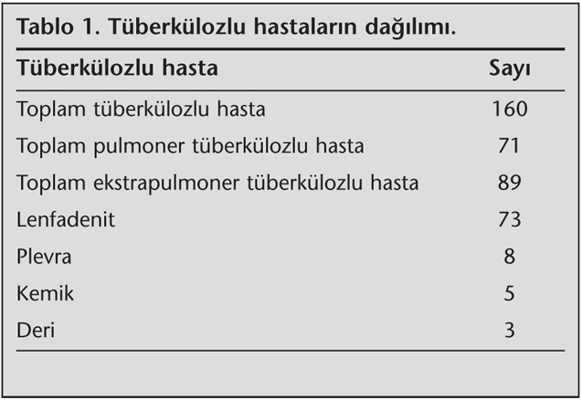 F?rat ?niversitesi T?p Fak?ltesi etik kurulu taraf?ndan 13.09.2009 tarih ve 148 say?l? yaz? ile onaylanan ?al??mada, Eyl?l 2009-May?s 2011 tarihleri aras?nda F?rat ?niversitesi T?p Fak?ltesi G???s Hastal?klar? Poliklini?inde pulmoner ve ekstrapulmoner t?berk?loz tan?s?yla takip ve tedavileri yap?lan hastalardan; kendilerinin, birinci derece yak?nlar?n?n, hastane otoriteleri ve hekimlerinin r?zas?yla kan ?rnekleri al?nd?. Kontrol grubunu ise, pulmoner ve ekstrapulmoner t?berk?loz ba?ta olmak ?zere herhangi bir organik ve kronik hastal??? olmayan, g?n?ll? sa?l?kl? bireylerden olu?turuldu. Hasta ve kontrol grubunun benzer co?rafi b?lgelerden olmas?na dikkat edildi. ?al??mam?z 160 sa?l?kl? kontrol grubu ile 160 pulmoner ve ekstrapulmoner t?berk?loz hastas?ndan olu?maktad?r. T?berk?loz hastalar?n?n da??l?m? Tablo 1'de g?sterilmi?tir.