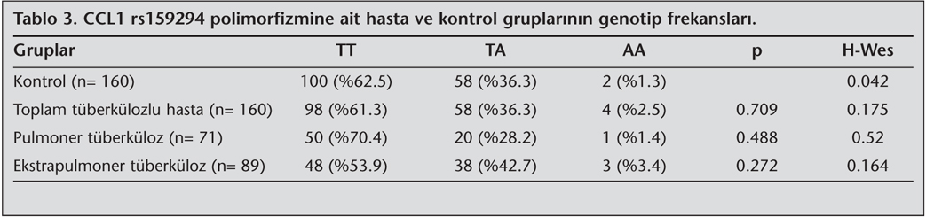 Hasta ve kontrol grubu ile yapt???m?z ?al??ma sonucunda CCL1 geni i?in 160 t?berk?lozlu hastan?n 98 (%61.3)'inde TT genotipi, 58 (%36.3)'inde TA genotipi, 4 (%2.5)'?nde de AA genotipi, 71 pulmoner t?berk?lozlu hastan?n 50 (%70.4)'sinde TT genotipi, 20 (%28.2)'sinde TA genotipi, 1 (%1.4)'inde de AA genotipi, 89 ekstrapulmoner t?berk?lozlu hastan?n 48 (%53.9)'inde TT genotipi, 38 (%42.7)'inde TA genotipi, 3 (%3.4)'?nde de AA genotipi tespit edilmi?tir. Kontrol grubunda ise 160 sa?l?kl? bireyin 100 (%62.5)'?nde TT genotipi, 58 (%36.25)'inde TA genotipi, 2 (%1.3)'sinde de AA genotipi belirlenmi?tir (Tablo 3). CCL1 rs159294 polimorfizminde genotip frekanslar? ki-kare testi kullan?larak, hasta ve kontrol gruplar? kar??la?t?r?ld???nda istatistiksel olarak anlaml? bir farkl?l?k saptanamam??t?r (p> 0.05). Kontrol grubunun genotip da??l?m? Hardy Weinberg dengesi i?inde olmay?p (p< 0.05), hastalar?n genotip da??l?mlar?n?n Hardy Weinberg dengesi i?inde oldu?u belirlenmi?tir (p> 0.05).