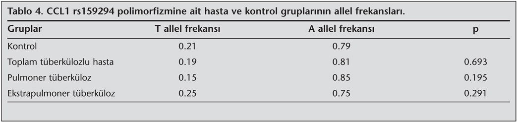 CCL1 i?in, toplam, pulmoner ve ekstrapulmoner t?berk?lozlu hastalarda T allel frekanslar? s?ras?yla; 0.19, 0.15, 0.25 olarak saptanm??; kontrol grubunda ise T allel frekans? 0.21 olarak belirlenmi?tir. A allel frekanslar? ise toplam, pulmoner ve ekstrapulmoner t?berk?lozlu hastalarda s?ras?yla; 0.81, 0.85, 0.75, kontrol grubunda ise 0.79 olarak tespit edilmi?tir (Tablo 4). Allel frekanslar? ki-kare testi kullan?larak, hasta ve kontrol gruplar? kar??la?t?r?ld???nda istatistiksel olarak anlaml? bir farkl?l???n olmad??? g?r?lm??t?r (p> 0.05).