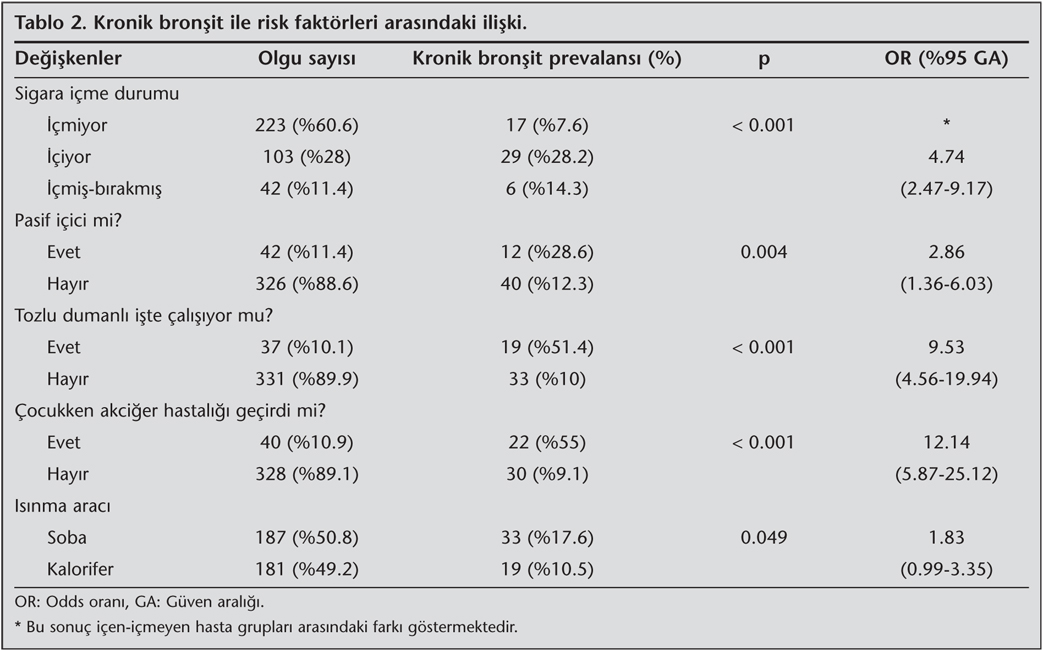 Tozlu dumanl? i?te ?al??an olgularda kronik bron?itin daha fazla oldu?u saptanm??t?r (p< 0.001, OR 9.53, %95 GA 4.56-19.9) (Tablo 2). ?ocukken akci?er hastal??? ge?irenlerde ge?irmeyenlere g?re 12.14 kat daha fazla kronik bron?it geli?ti?i saptanm??t?r (p< 0.001, %95 GA 5.87-25.12). Ayr?ca ?al??mada ?s?nma arac? olarak soba kullananlar?n, kalorifer kullananlara g?re biraz daha fazla kronik bron?it oldu?u bulunmu?tur (p= 0.049, OR 1.83, %95 GA 0.99-3.35) (Tablo 2).