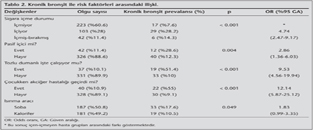 Bulgular: ?al??mada kronik bron?it prevalans? %14.1 olarak bulunmu?tur. Kronik bron?it saptananlar?n ya? ortalamas? 43.2 ? 12.9 y?l iken, saptanmayanlar?n ya? ortalamas? 39.3 ? 11.6 y?ld?r ve aradaki fark istatistiksel olarak anlaml?d?r (p< 0.05). Kronik bron?it g?r?lmesiyle sigara i?imi aras?ndaki ili?ki incelendi?inde sigara i?enlerde i?meyenlere g?re daha fazla hastal?k olu?tu?u g?r?lm??t?r (p< 0.001, OR 4.74, %95 GA 2.47-9.17). Pasif i?iciler incelendi?inde ise sigara i?meyenlere g?re daha fazla kronik bron?it olduklar? saptanm??t?r (p= 0.004, OR 2.86, %95 GA 1.36-6.03). Tozlu dumanl? i?te ?al??ma ve ?ocukken akci?er hastal??? ge?irmenin kronik bron?it prevalans?n? art?rd??? g?r?lm??t?r (s?ras?yla p< 0.001, OR 9.53, %95 GA 4.56-19.94; p< 0.001, OR 12.14, %95 GA 5.87-25.12). Erkek cinsiyet, d???k gelir seviyesi, soba ile ?s?nmak tek de?i?kenli lojistik regresyon analizinde anlaml? bulunmu?ken, ?ok de?i?kenli analizde istatistiksel olarak anlaml? bulunmam??t?r. E?itim seviyesi her iki analizde de istatistiksel olarak anlams?z bulunmu?tur (p< 0.05).