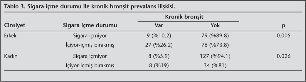 Kronik bron?it ile sigara i?me durumu aras?ndaki ili?ki incelendi?inde sigara i?enlerde i?meyenlere g?re daha fazla hastal?k olu?tu?u g?r?lm??t?r (p< 0.001) (Tablo 2). Yap?lan ikili analizlerde sigara i?meyenler ve i?mi? b?rakm?? olanlar ile sigara i?enler ve i?mi? b?rakm?? olanlar aras?nda fark bulunmam??t?r (p> 0.05). Ancak sigara i?enlerin kronik bron?ite yakalanma riski i?meyenlere g?re 4.7 kat daha fazlad?r (OR 4.74, %95 GA 2.47-9.17). Ayr?ca, kronik bron?it g?r?lenlerin paket/y?l a??s?ndan sigara t?ketimi g?r?lmeyenlere g?re istatistiksel a??dan anlaml? seviyede y?ksektir (p< 0.001). Cinsiyete g?re sigara i?menin kronik bron?it geli?imine etkisi incelendi?inde hem erkek hem de kad?nlarda sigara i?iyor veya i?mi? olman?n sigara i?memi? olmaya g?re istatistiksel olarak anlaml? farkl?l?k olu?turdu?u saptanm??t?r (s?ras?yla p= 0.005, p= 0.026) (Tablo 3).
