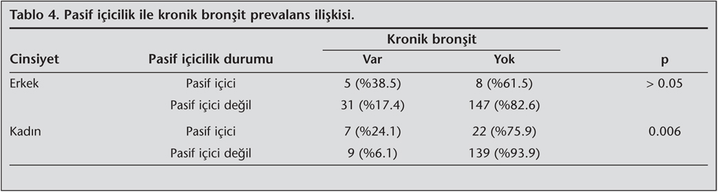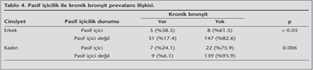 Pasif i?iciler incelendi?inde ise sigara i?meyenlere g?re daha y?ksek kronik bron?it prevalans? saptanm??t?r (p= 0.004, OR 2.86, %95 GA 1.36-6.03) (Tablo 2). Ayr?ca pasif i?ici olan kad?nlarda kronik bron?it geli?imi pasif i?ici olmayanlara g?re anlaml? seviyede y?ksek bulunmu?ken, bu a??dan erkeklerde anlaml? farkl?l?k bulunmam??t?r (s?ras?yla p= 0.006, p> 0.05) (Tablo 4).