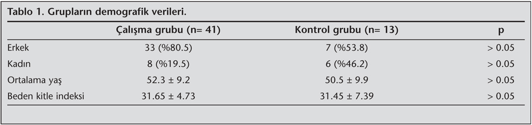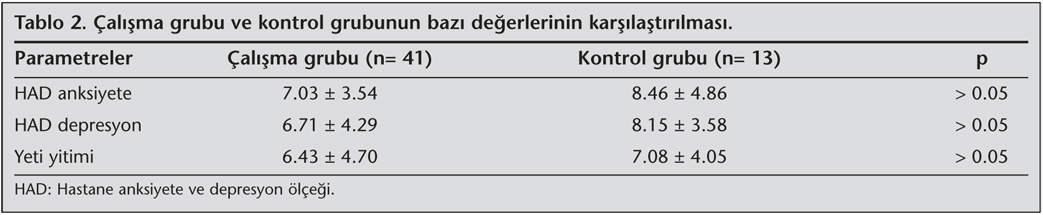 ?al??mam?za 41'i OUAS'l? hasta, 13'? basit horlamal? kontrol grubu olmak ?zere toplam 54 ki?i al?nd?. Hastalar?n demografik verileri Tablo 1'de g?sterilmi?tir. ?al??ma grubundaki 41 (%100) hastan?n horlamas?, 31 (%79.5) hastan?n tan?kl? apnesi ve 23 (%60.5) hastan?n g?nd?z a??r? uyku hali mevcuttu. ?al??ma grubu ile kontrol grubu aras?nda ya?, BK?, uyku s?resi, uyku etkinli?i ve EUS puan? a??s?ndan fark yoktu. ?al??ma grubu ve kontrol grubunun HAD anksiyete, HAD depresyon ve yeti yitimi a??s?ndan farklar? Tablo 2'de verilmi?tir. HAD anksiyete ve depresyon puan?, yeti yitimi de?erleri iki grup aras?nda istatistiksel olarak farkl? de?ildi (p> 0.05) (Tablo 2). Stresle ba?a ??kma de?erlendirmesinde i?e kapanman?n OUAS'l?larda daha fazla oldu?u g?r?ld? (p= 0.031). Ayr?ca, orta ve a??r OUAS'l?larda sosyal destek arama ihtiyac?n?n artm?? oldu?u saptand? (p= 0.037).