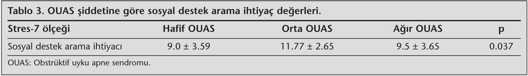 Hastalar hafif, orta ve a??r OUAS olarak grupland?r?ld???nda stresle ba?a ??kma ?l?e?inde Stres-7 i?in gruplar aras?nda farkl?l?k g?r?ld? (p= 0.037) (Tablo 3).