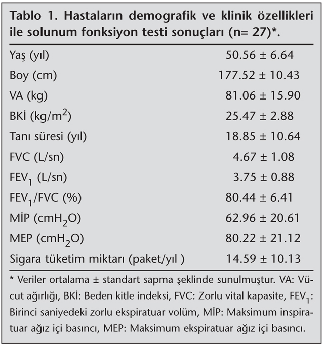 Bulgular: Tan? s?resi 18.85 ? 10.64 y?l olan hastalar?n, FEV1 de?eri 3.75 ? 0.88 L/sn, FEV1/FVC oran? 80.44 ? 6.42, M?P de?eri 62.96 ? 20.61, MEP de?eri 80.22 ? 21.12 idi. Hastalar?n %40.7'sinde sigara ?yk?s? pozitifti ve %14.8'inde nefes darl???, %11.1'inde ?ks?rme-balgam semptomu mevcuttu. Hastalar?n %88.9'unun d?zenli olarak egzersiz (jogging, bisiklet) yapt??? saptand?. Y?r?me mesafeleri 595.50 ? 83.20 metre idi. Ya?am kalitesi kategori skorlar? minimum 42.82 ? 16.78, maksimum 83.58 ? 23.06 idi. Sigara i?en ve i?meyen hastalar?n solunum fonksiyon testi de?erleri ve solunum kas kuvvetlerinin benzer oldu?u, ancak sigara i?en hastalar?n ya?am kalitelerinin fiziksel fonksiyon ve sosyal fonksiyon skorlar?nda i?meyenlere g?re daha fazla azalma oldu?u saptand?.