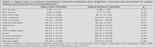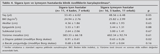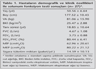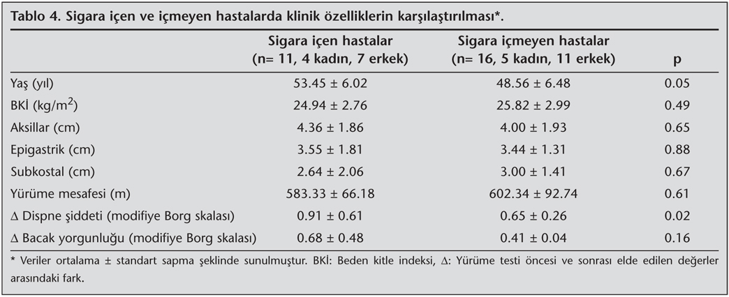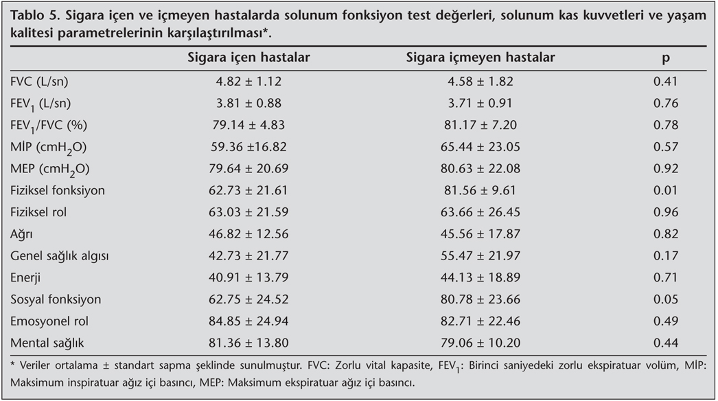Solunum fonksiyonlar?n?, ya?am kalitesini ve egzersiz kapasitesini etkileyen en ?nemli fakt?r olan sigaraya g?re elde edilen veriler analiz edildi?inde; sigara i?en ve i?meyen hastalar?n demografik ve klinik ?zelliklerinin ya? fakt?r? ve dispne ?iddetleri d???nda birbirleriyle benzer oldu?u bulundu (p> 0.05, Tablo 4). Sigara i?en ve i?meyen hastalar?n solunum fonksiyon testi de?erleri ve solunum kas kuvvetlerinin iki grupta benzer oldu?u bulundu (p> 0.05). Ancak sigara i?en hastalar?n fiziksel fonksiyon ve sosyal fonksiyon skorlar?nda i?meyenlere g?re daha fazla azalma oldu?u saptand? (p≤ 0.05, Tablo 5).