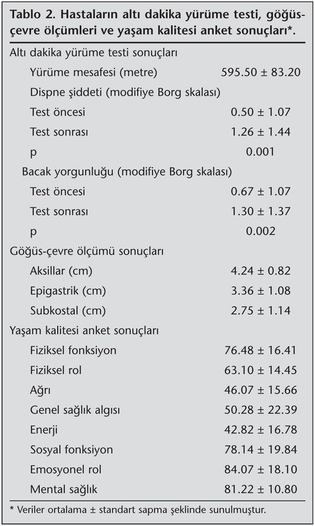 Hastalar?n alt? dakika y?r?me testi sonunda y?r?me mesafelerinin ortalama 595.50 ? 83.20 metre oldu?u ve test s?ras?nda dispne ?iddetlerinin ve bacak yorgunluklar?n?n anlaml? derecede artt??? bulundu (p< 0.05). Hastalar?n g???s ?evre ?l??m sonu?lar? yorumland???nda aksillar b?lgeden derin inspirasyon ve zorlu ekspirasyonda al?nan ?l??m farklar?n?n epigastrik ve subkostal b?lgelere g?re daha fazla oldu?u g?r?ld?. Sa?l?kla ilgili ya?am kalitesi de?erlendirildi?inde; SF-36 ya?am kalitesi anketinin genel sa?l?k alg?lamas? kategori skorunun ortalama 50.28 ? 22.39, a?r? kategorisi skorunun ortalama 46.07 ? 15.66 ve enerji kategorisi skorunun ortalama 42.82 ? 16.78 olarak di?er kategorilerden daha d???k de?erlere sahip olduklar? bulundu (Tablo 2).