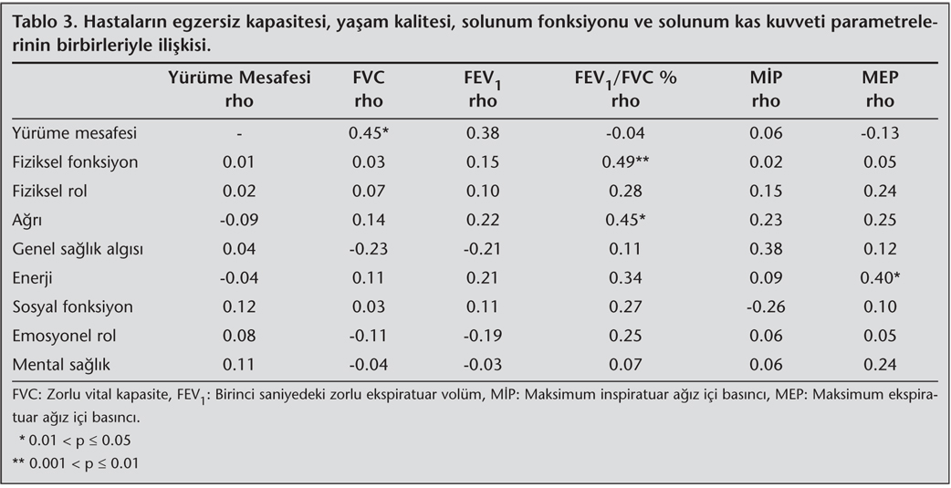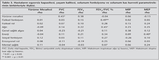 Hastal?kla ilgili kazan? parametrelerinin birbirleriyle ili?kisi incelendi?inde; y?r?me mesafesi ile FVC aras?nda istatistiksel olarak anlaml? derecede bir korelasyon (rho= 0.45, p= 0.03) saptanmas?na ra?men, y?r?me mesafesiyle solunum kas kuvveti ve ya?am kalitesi anketinin t?m kategorileri aras?nda anlaml? korelasyon olmad??? g?r?ld? (p> 0.05). Ya?am kalitesi parametreleriyle solunum fonksiyon testi ve solunum kas kuvveti parametreleri aras?ndaki ili?ki incelendi?inde; ya?am kalitesi anketinin fiziksel fonksiyon (rho= 0.49, p= 0.01) ve a?r? (rho= 0.46, p= 0.02) kategorileriyle FEV1/FVC oran? aras?nda istatistiksel olarak anlaml? derecede bir korelasyon oldu?u bulundu (p< 0.05). Ya?am kalitesi anketinin enerji parametresi ile MEP de?eri aras?nda (rho= 0.40, p= 0.04), genel sa?l?k kategorisi ile nefes darl??? (rho= -0.48, p= 0.01) ve g???s kafesinde s?k??ma hissi varl??? (rho=-0.41, p= 0.03) aras?nda korelasyon oldu?u saptand? (p< 0.05). G???s ?evresi ?l??m farklar?yla y?r?me mesafesi aras?nda anlaml? korelasyon olmad??? (p> 0.05), ancak epigastrik ?l??m fark? ile ya?am kalitesinin fiziksel rol parametresi aras?nda istatistiksel olarak anlaml? derecede bir korelasyon oldu?u bulundu (rho= 0.38, p= 0.04, Tablo 3).