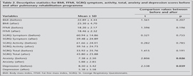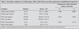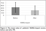 Health related quality of life before and after pulmonary rehabilitation programme were assessed by SGRQ which is composed of 3 domains (symptom, anxiety, impact) (Table 4). There were statistically significant improvements in SGRQ's impact score (Z= 1.988; p= 0.047). While the mean value of impact score before pulmonary rehabilitation was 48.11 ? 30.60, it was found 29.52 ? 27.84 after pulmonary rehabilitation (Figure 2). Statistically significant improvements were not observed in symptom, activity and total score (p= 0.755, 0.785 and 0.191, respectively).