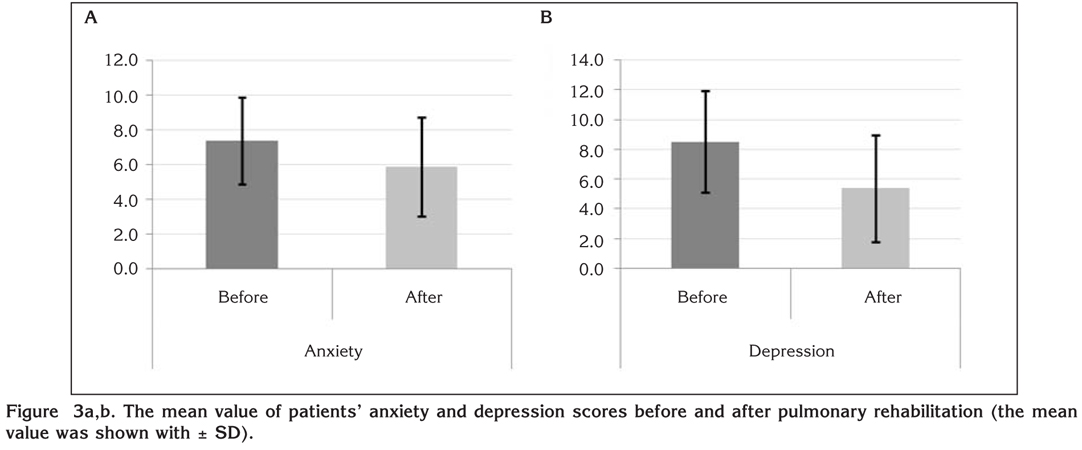 Anxiety and depression are the most important psychosocial problems that could frequently be observed in ILD. It was also evaluated in our study by using HADS, consisting of 14 items. Anxiety and depression scores after pulmonary rehabilitation showed statistically significant improvements (t= 2.806; p= 0.026 and t= 2.538; p= 0.039, respectively) (Figure 3a,b).