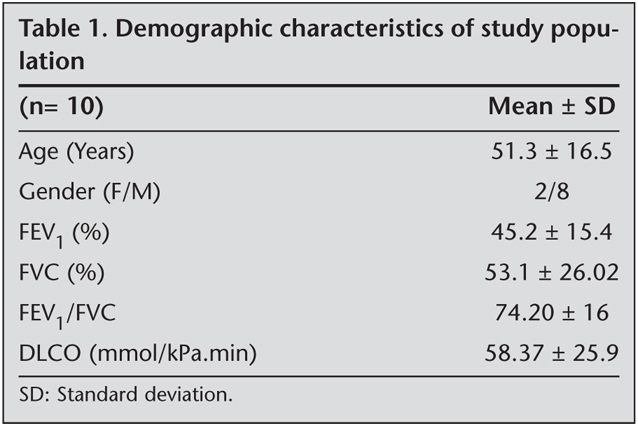 The mean age of patients included in the study was 51.30 ? 16.55 years. In patients with ILD, diffusion capacity for carbon monoxide (DLCO) was also found to be decreased at rest (mean DLCO was 58.37 ? 25.97 % mmol/kPa.min). Two out of 10 patients did not show any compliance to the diffusion test. As shown in Table 1, patients had consistent mild restrictive defect in respiratory function test. Five out of 10 patients had also been using long term oxygen therapy at home.
