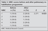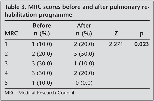 Grade 5 MRC dyspnea score was observed in only one patient (10%). Grade 4 was seen in 3 patients (30%), and 3 patients had grade 3 (30%). After pulmonary rehabilitation improvements in dyspnea sensation reached statistically significant level (Z= 2.271; p= 0.023). Before and after pulmonary rehabilitation MRC scores of patients who completed the study protocol was shown in Table 3.
