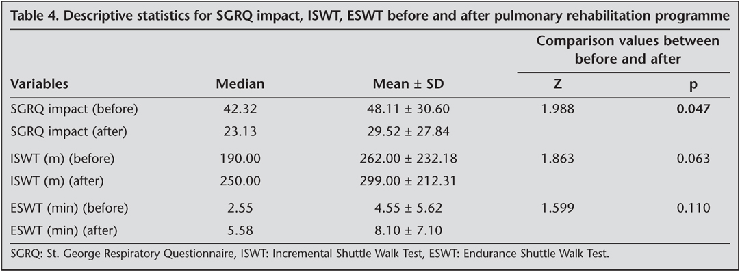 Before the pulmonary rehabilitation programme, the mean distance walked in ISWT was 262.00 ? 232.18 m, whereas it was 299.00 ? 212.31 m at the end of the pulmonary rehabilitation. The difference between median values before and after pulmonary rehabilitation was 60 meters. Though, it was not statistically significant (Z= 1.863; p= 0.063), the level of increment in walking distance was higher than the minimally important clinical difference for ISWT. In ESWT patients walked 4.55 ? 5.62 (mean) minutes before and 8.10 ? 7.10 (mean) minutes after the PR programme. The improvements in endurance time did not also reveal any statistical significance (Z=1.599; p= 0.110).