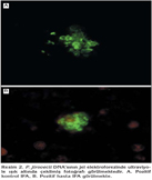 BAL ve BL ?rneklerinde metenamin g?m?? (Gomori/Grocott), toluidin mavisi, Wright-Giemsa boyamalar? ile etken saptanmad?. Nested PCR ile 16 hastada P. jirovecii'nin DNA's? saptand? (Resim 1). ?mm?n floresans antikor (IFA) testiyle 13 hastada P. jirovecii'nin kistleri saptand? (Resim 2 A,B).