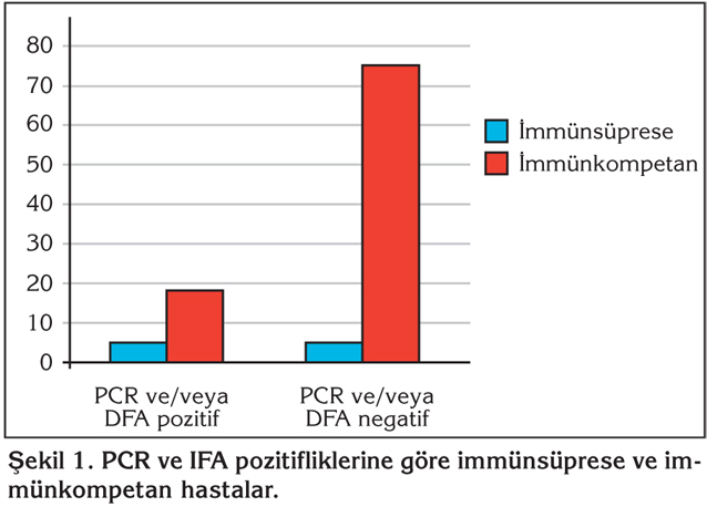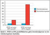 Olgu gruplar? PCR ve IFA pozitifliklerine g?re gruplara ayr?larak de?erlendirme yap?ld???nda IFA veya PCR pozitif olgularda imm?ns?presyon a??s?ndan anlaml? farkl?l?k saptand? (p= 0.003). Pozitif olgular?n %28.6's? imm?ns?prese iken, PCR veya IFA negatif olgular?n %3.8'i imm?ns?prese idi (?ekil 1).