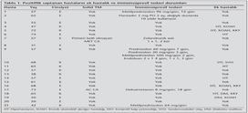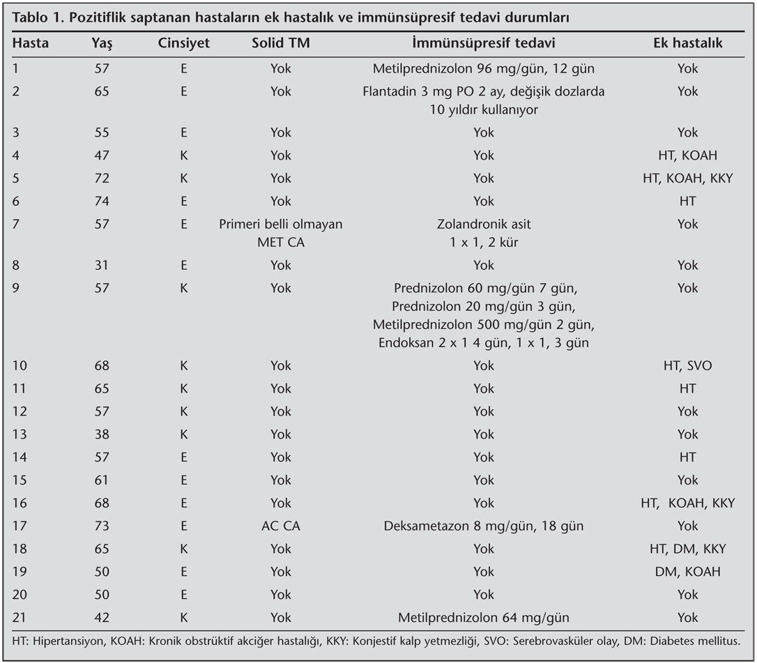 Ek hastal??? olan 11 (%52.3) hasta mevcut olup; 6 (%28.5) hastada birden fazla hastal?k mevcuttu. Ek hastal?klar incelendi?inde iki hastada malignite (akci?er kanseri ve primeri belli olmayan metastatik akci?er kanseri), sekiz hastada hipertansiyon, iki hastada diabetes mellitus (DM), d?rt hastada kronik obstr?ktif akci?er hastal??? (KOAH), bir hastada serebrovask?ler olay (SVO), ?? hastada konjestif kalp yetmezli?i (KKY) mevcuttu. Pozitiflik saptanan alt? hastada son ?? ay i?inde imm?ns?presif tedavi al?m ?yk?s? vard? (Tablo 1). ?mm?ns?presif tedavi iki hastada malignite nedeniyle di?er hastalarda ise kollajen doku hastal??? nedeniyle verilmekteydi.
