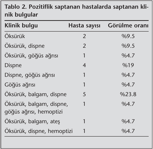 Pozitiflik saptanan hasta grubundaki hastalar?n klinik bulgular? incelendi?inde ?ks?r?k, balgam, dispne, hemoptizi, g???s a?r?s?, ate? y?ksekli?i ve gece terlemesi oldu?u g?r?ld?. Olgu grubundaki iki hastada ise hi?bir klinik bulgu yoktu (Tablo 2).