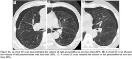 An 81-year-old man with COPD presented with breathlessness on exertion two days before visit to our hospital. He had smoked 20 pack/years. A plain chest radiograph demonstrated a small pneumothorax. Arterial blood gas analysis revealed that PaO2 was 103.6 torr, PaCO2 49.7 torr, and pH 7.345 with 2 L/min oxygen. A chest CT scan showed the volume of the pneumothorax was less than 20% (Figure 1B). Without insertion of chest tube, he had enough security in cardiopulmonary monitoring for a week. Over a period of 10 days, the pneumothorax resolved.