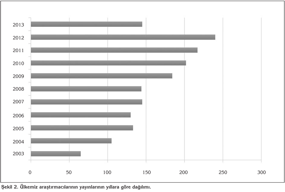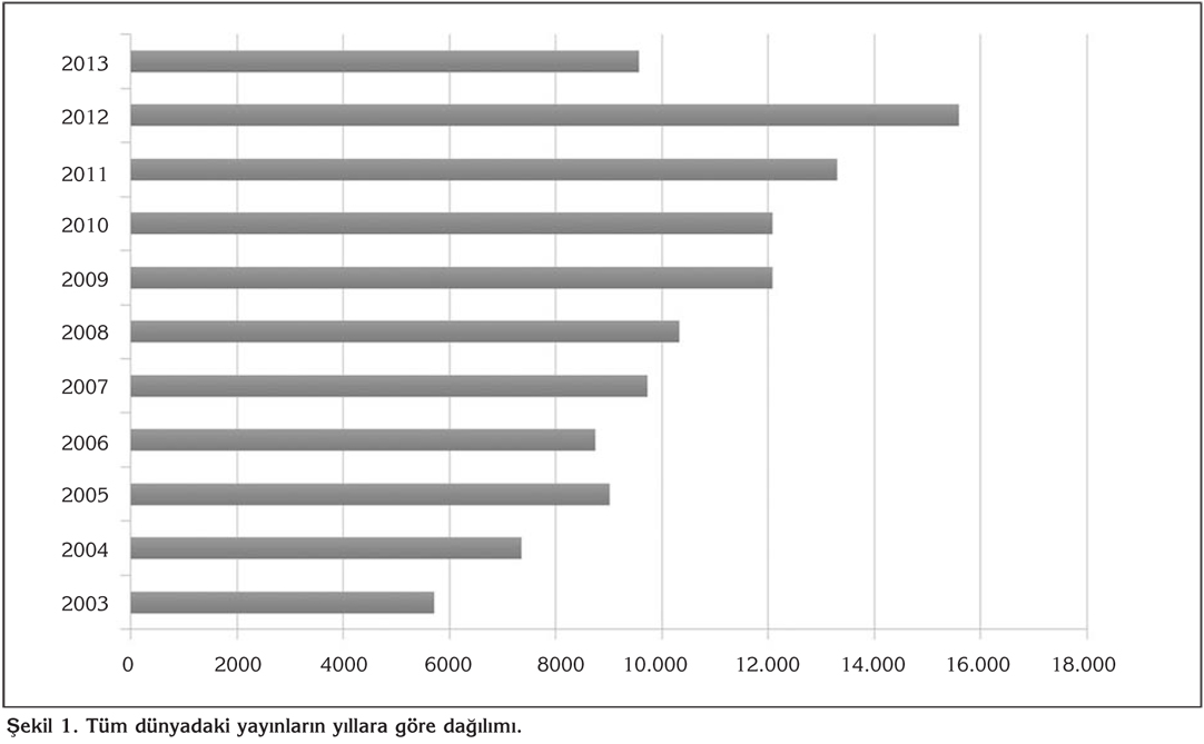 D?nyada 2003 y?l?ndan bu tarafa her y?l artan say?da ara?t?rman?n oldu?u g?r?lmektedir. ?lkemizden ise 2012 y?l?nda en y?ksek say?da bilimsel yay?n (240 yay?n) d?nya literat?r?ne eklenmi?tir. Yay?nlar?n y?llara g?re da??l?m? ?ekil 1 ve 2'de g?sterilmi?tir.
