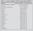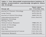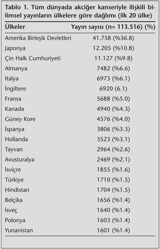 Bu ama?la, d?nyada ve ?lkemizde 2003-2013 y?llar? aras?nda ?Science Citation Index (SCI)? ve Science Citation Index-Expanded (SCI-E)? kapsam?nda olan dergilerde yay?nlanm?? akci?er kanseri konusundaki b?t?n ?al??malar de?erlendirildi. Bu de?erlendirme i?in Thomson Reuters Web of Knowledge-Web of Science yaz?l?m? kullan?ld? (07.10.2013). Ayr?ca, ?lkemizdeki ara?t?rmac?lar?n kat?lm?? olduklar? bilimsel yay?nlar?n ?zetleri incelendi. T?m d?nyada 2003-2013 y?llar? aras?nda akci?er kanseri hakk?nda toplam 113.516 bilimsel yay?n oldu?u tespit edildi. Yay?nlar?n ?lkelere g?re da??l?m? Tablo 1'de g?sterilmi?tir. ?lkemiz ara?t?rmac?lar?n?n bu yay?nlardan 1710'una kat?lm?? olduklar? ve yay?n say?s?na g?re s?ralamada 15. s?rada yer ald?klar? g?r?ld? (Tablo 1).