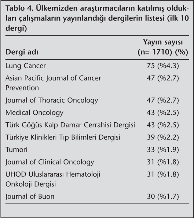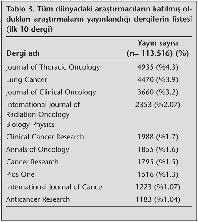 Bu ?al??malar?n SCI ve SCI-E kapsam?nda yay?nland??? ilk 10 dergi Tablo 3'te g?sterilmektedir. Klinik onkoloji dergilerinin yan? s?ra kanser ara?t?rma dergilerinin de bu s?ralamada ?nlerde yer almas? akci?er kanseri konusunda yap?lan deneysel ara?t?rmalar?n ve yeni geli?tirilecek y?ntemlerin g?ndemde oldu?unu g?stermektedir.