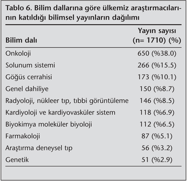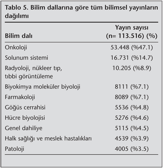 T?m yay?nlar?n bilim dallar? incelendi?inde onkolojiden sonra ikinci s?rada yer alan bilim dal? solunum sistemi olmas?na kar??n g???s hastal?klar?yla ili?kili dergilerin ilk 10 s?rada yer almad?klar? dikkati ?ekmektedir. Bu durum; g???s hastal?klar? dergilerinin akci?er kanseri d???ndaki di?er konularda daha fazla yay?n kabul etmeleri veya ara?t?rmac?lar?n akci?er kanseri konusunda yapm?? olduklar? yay?nlar? ?ncelikli olarak onkoloji ve/veya ara?t?rma (research) alan?ndaki dergilere g?ndermeyi tercih etmeleriyle a??klanabilir.