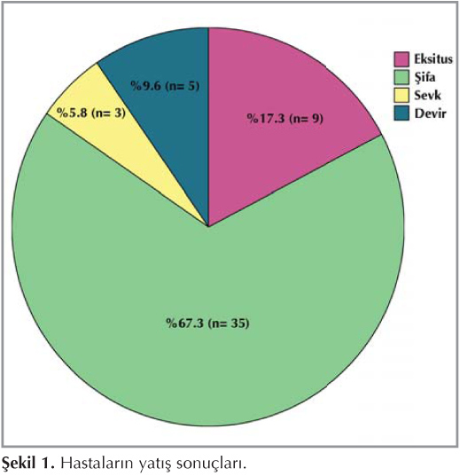 Hastalar?n ?o?unlu?u ?ifa ile taburcu olmu?tu (%67.3). T?m hastalar?n mortalite oran? %17.3 idi. Yat?? sonu?lar? ?ekil 1'de g?r?lmektedir. Pn?moni olgulardaki mortalite oran? %17.6 saptand?. Pn?moni nedeniyle yatan ve konjestif kalp yetmezli?i olan olgular?n %45.5 (n= 5)'i, KKY olmayan olgular?n ise %6.3 (n= 1)'? eksitus olmu?tu ve oranlar? aras?ndaki fark anlaml?yd? (p= 0.027).