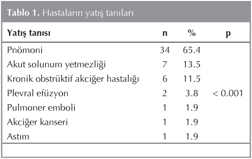 Yat?? nedenleri bak?m?ndan hasta oranlar?n?n anlaml? d?zeyde farkl? oldu?u belirlendi (p< 0.001). En fazla yat???n pn?moni nedenli oldu?u g?zlendi (%65.4). En s?k ikinci ve ???nc? yat?? tan?lar? ise s?ras?yla akut solunum yetmezli?i ve kronik obstr?ktif akci?er hastal??? (KOAH) idi. Hastalar?n yat?? tan?s? ve s?kl?klar? Tablo 1'de sunulmu?tur.