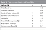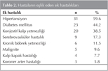 T?m hastalar?n %80.8 (n= 42)'inde e?lik eden en az bir ek hastal?k mevcuttu. S?ras?yla en s?k, hipertansiyon, diabetes mellitus ve konjestif kalp yetmezli?i e?lik etmekteydi. Hastalar?n ek hastal?klar? Tablo 2'de sunulmu?tur.