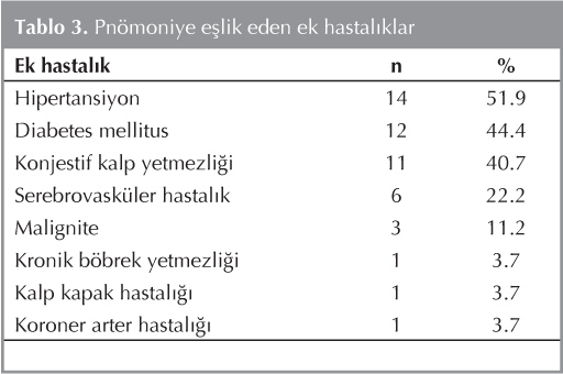 Pn?moni olgular?na en s?k hipertansiyon ek hastal?k olarak e?lik etmekteydi (%51.6). Pn?moniye e?lik eden ek hastal?klar Tablo 3'te sunulmu?tur.