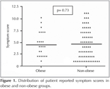 Asthma characteristics of the obese and non-obese groups were not statistically different (Table 2). Asthma symptom score in the obese group was 4.6 ? 2.6 while that in the non-obese group was 4.5 ? 3.1 (p= 0.73) (Figure 1). Age at onset of asthma symptoms was reported as 28.0 ? 25.6 months in obese children whereas that in the non-obese children was 35.7 ? 37.6 months (p= 0.86). Disease severity characteristics including days of bronchodilator and systemic steroid requirement as well as number of asthma exacerbations during the previous three month period were similar between the two groups (p> 0.1 for all). Number of hospitalization days and emergency department visits were not statistically different in obese and non-obese groups, either (0.6 ? 1.9 vs. 0.8 ? 2.2, p= 0.67 and 0.6 ? 0.6 vs. 0.7 ? 1.1, p= 0.96 respectively) (Table 2).
